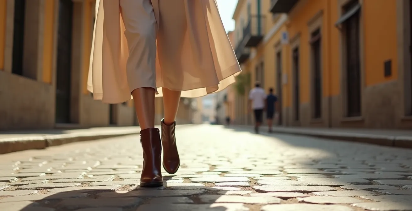 La elección del tacón va más allá de la altura; afecta directamente a la «geometría en movimiento». Una silueta alargada se proyecta a través de una postura erguida y un caminar seguro. Un tacón inestable sobre un terreno irregular, como los adoquines del Barrio Gótico de Barcelona o las cuestas del Albaicín de Granada, obliga a una postura encorvada que acorta la figura. Por tanto, la estabilidad del tacón es un factor fundamental de proporción. El tacón de bloque, con su mayor superficie de apoyo, es intrínsecamente más estable que un tacón de aguja. El tacón cubano, inclinado y de base ancha, ofrece un excelente compromiso entre estilo y firmeza.