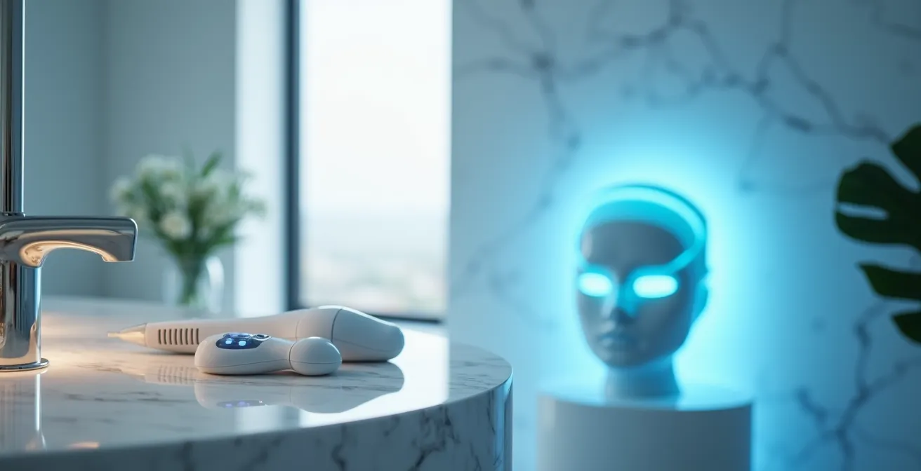 La respuesta habitual es que los aparatos caseros son «menos potentes pero más prácticos». Es una verdad a medias que no te ayuda a decidir. La verdadera clave no reside en la potencia del dispositivo, sino en la estrategia que hay detrás de su uso. Comprar un aparato de microcorrientes sin saber si tu problema es la flacidez muscular o la pérdida de colágeno es como comprar un martillo para atornillar un tornillo. Puede que con mucho esfuerzo y algo de suerte logres algo, pero lo más probable es que causes un estropicio. La tecnología es solo una herramienta; sin el conocimiento para usarla, es inútil e incluso contraproducente.